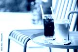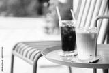 カフェのテラス席に置かれたアイスコーヒー、カフェオレ、2人分