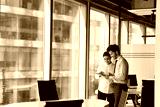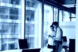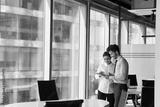 Two happy diverse coworker employees discussing online presentation on tablet computer, working on project together, standing in urban office business interior with glass wall window