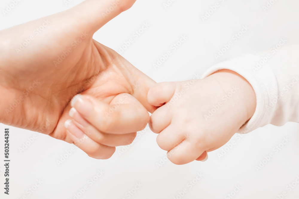 ukrainian baby holds mom's index finger on a white background. close up. emotional connection between mother and child. The grasping reflex in a child. Family, love, friendship.