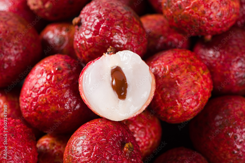 fresh litchi, lichee, lychee fruit on table