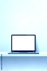 Laptop computer on white concrete shelf. Vertical background