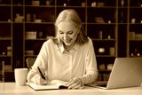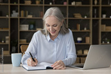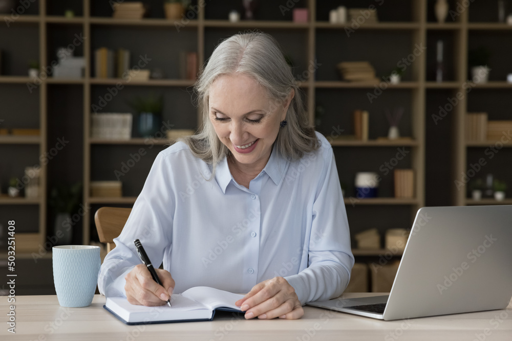 Happy busy senior freelance employee woman writing notes in note book at laptop. Senior student watching learning webinar on computer, smiling, enjoying online studying at home