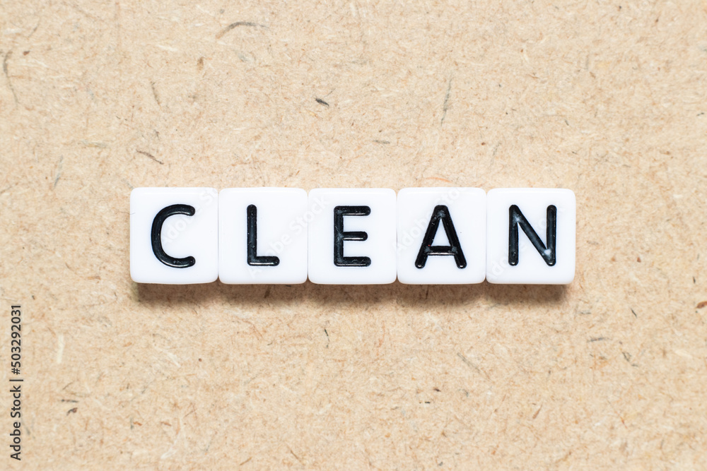 White tile alphabet letter with word clean on wood background