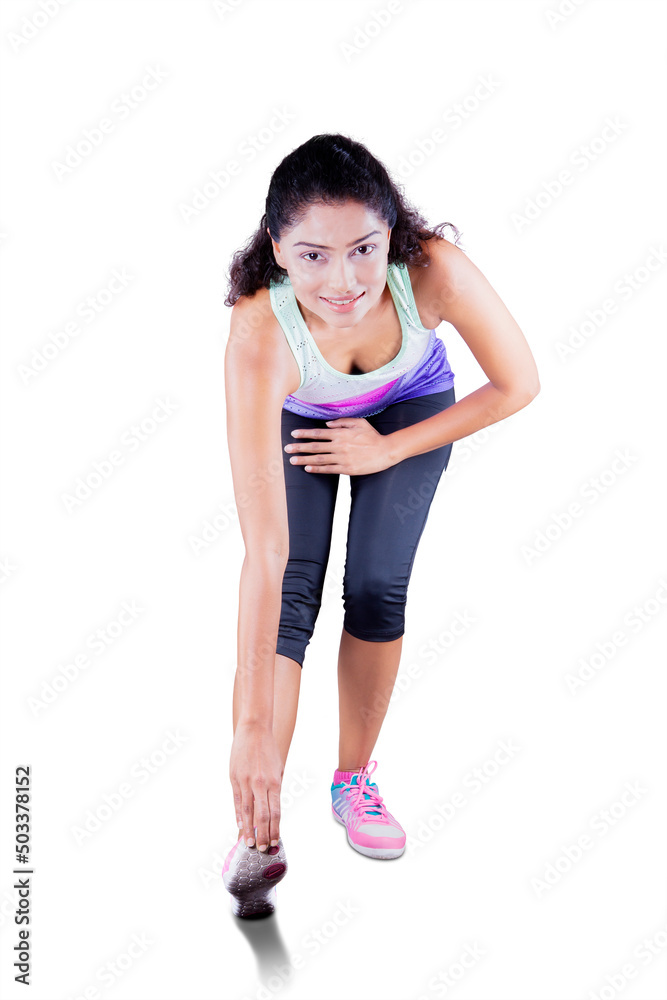 Curly hair woman stretching her foot on studio