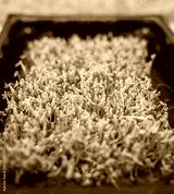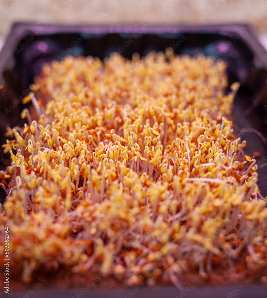 Purple micro-green radish sprouts in a tray or container under the lamp. Growing radish or basil sprouts in close-up at home. The concept of vegan and healthy food. Sprouted seeds, micro-greens