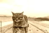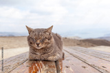 A beautiful gray cat in close-up lies and rests on a table in nature. The cat then looks into the camera then sleeps.