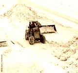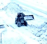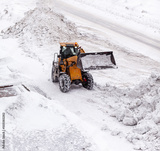 Small snow removal vehicle removing snow on city square. Yellow or orange tractor cleaning the snow on a street. Loader machine removing snow in winter.