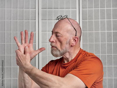 senior man is practicing reflexology therapy to his hand, self care and massage concept