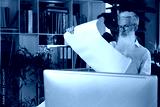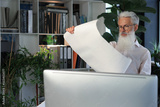 Handsome mature business man using blueprint while working in the modern working space.