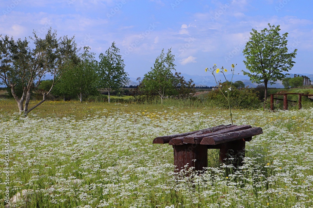 Drewniana ławka na kwiecistej łące