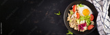 Breakfast oatmeal porridge with fried egg, tomatoes and lettuce. Healthy balanced food. Savoury oatmeal. Top view, banner