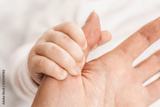 baby hand holds mom thumb. close up. Baby's grasp reflex. Parental care. Emotional bond between mother and son