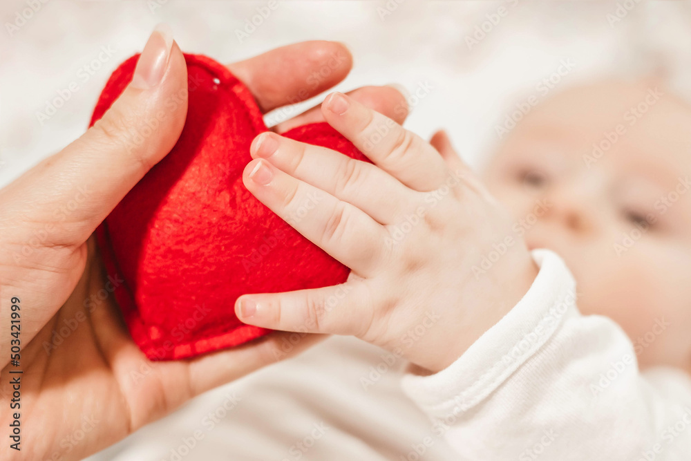 emotional bond between mother and child. baby holds a red heart in his hands. Medicine, child health. humanitarian aid