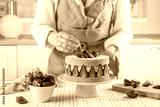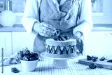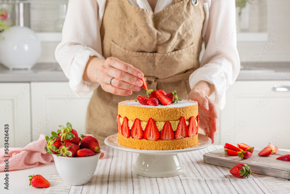 Woman in apron cooking French Fraisier Cake in the home kitchen. Fruitcake made with two layer of Genoise Sponge, Diplomat Cream and Fresh Strawberries.