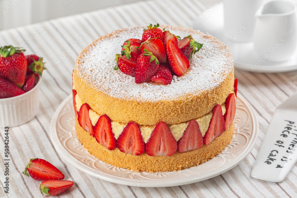 Homemade summer Fruitcake. French Fraisier Cake made with two layer of Genoise Sponge, Diplomat Cream and Fresh Strawberries.