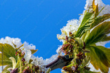 A sprig of maples with young leaves covered with melting snow on a spring day close-up