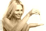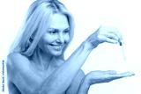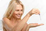 Charming blonde 40s lady using anti-aging complex with hyaluronic acid isolated on white background. Sophisticated middle aged woman applies regenerating serum on the face. Skincare concept