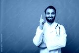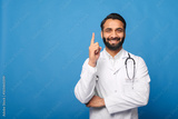 Young indian male medical worker wearing white gown with stethoscope over shoulders standing isolated blue background pointing finger up with successful idea, doctor found solution