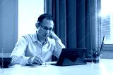 Man working from home on her laptop looked worried, exhausted, and overwhelmed.