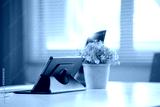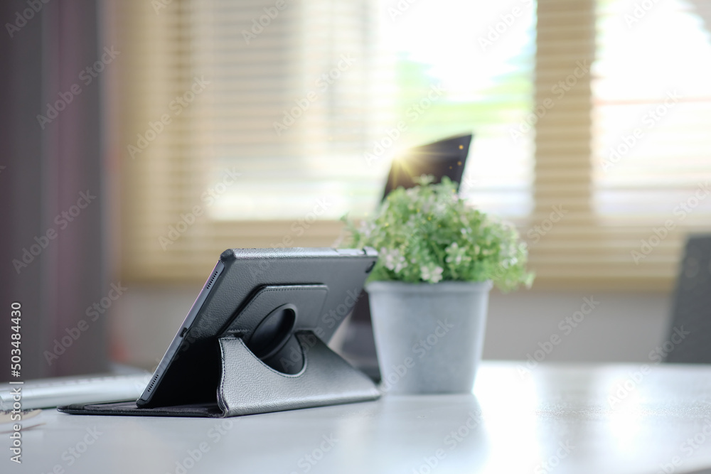 Close up view of portable workspace with laptop, stationery and plant pot o the table in home office