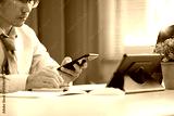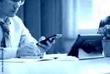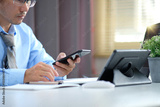 Businessman works on his computer. In the office, a young professional is utilizing a laptop and a smartphone. Management, finance, and business theory