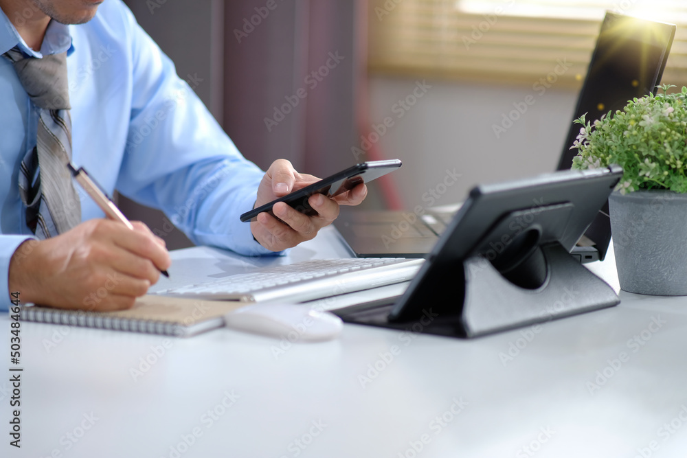 Businessman using smart phone and laptop at office. Businessman or student working on computer and texting smartphone. Freelance, education and technology concept