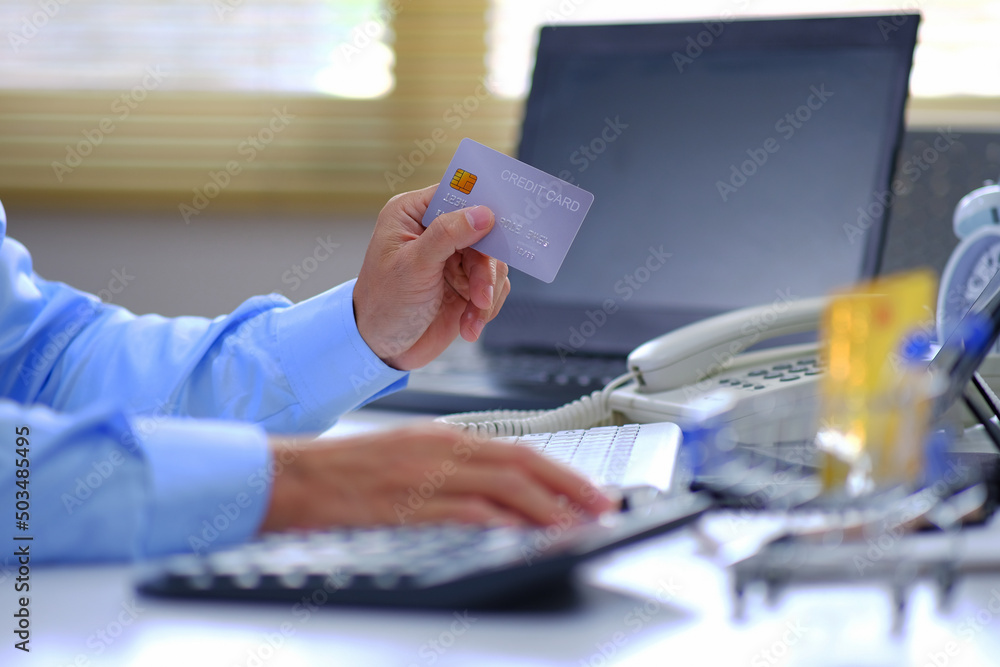 Man uses a laptop while clutching a credit card. Working as a businessman or entrepreneur, Working from home, online shopping, e-commerce, internet banking, spending money