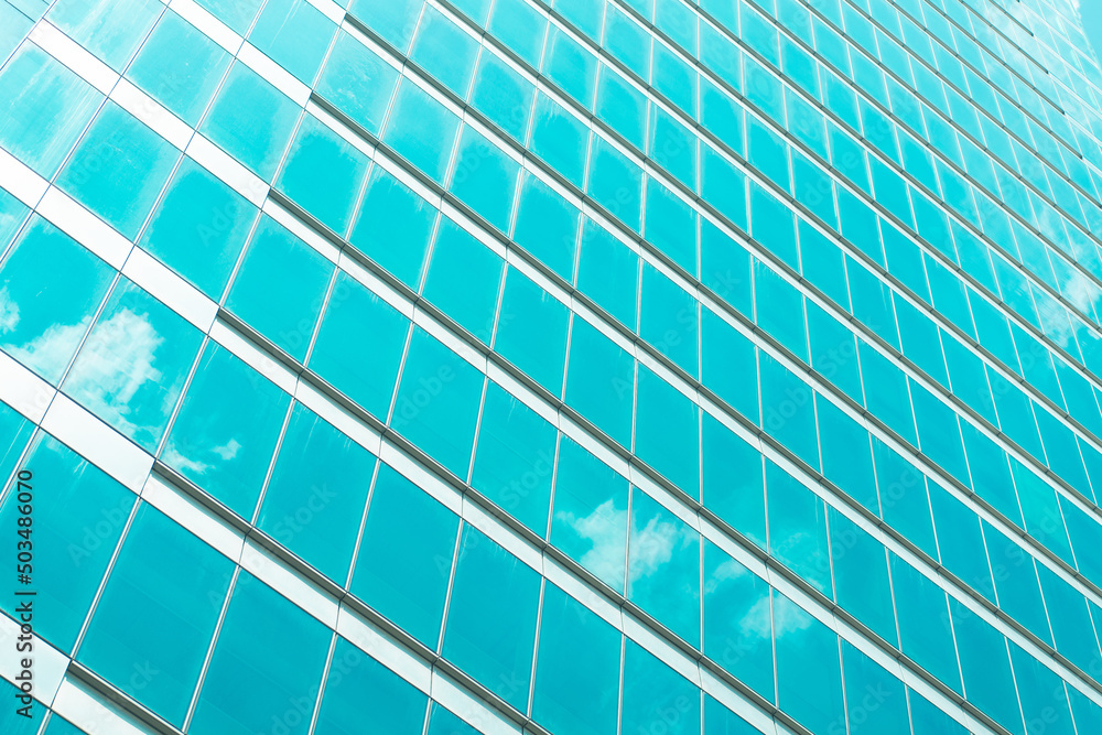 underside panoramic and perspective view to steel blue glass high rise building skyscrapers
