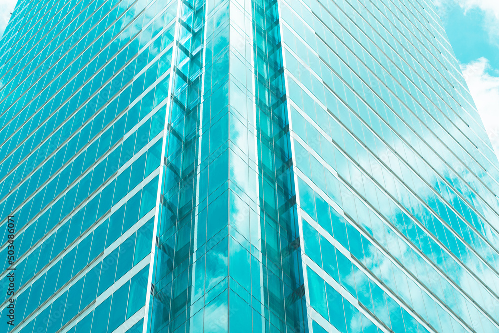 underside panoramic and perspective view to steel blue glass high rise building skyscrapers