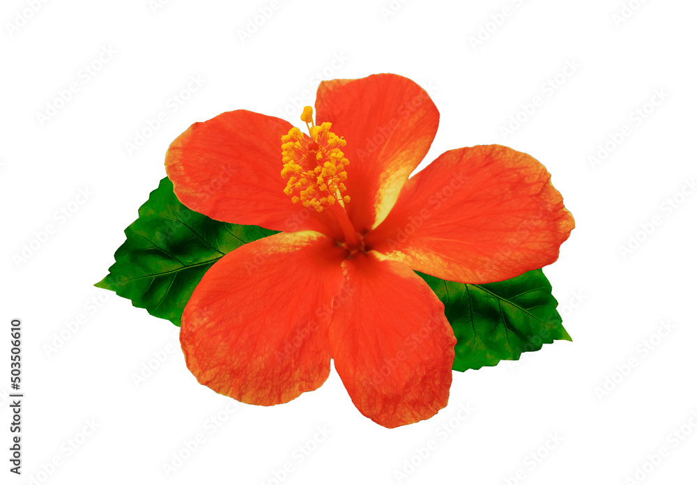 Closeup of orange hibiscus flower blossom blooming isolated on white background, stock photo, spring summer flower, single plants