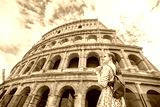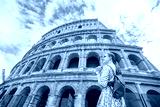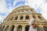 Happy woman tourist looking up at Colosseum. Rome. Italy trip.