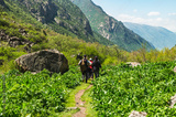 Tourists walk along a mountain path on a sunny day.Mountain landscape.