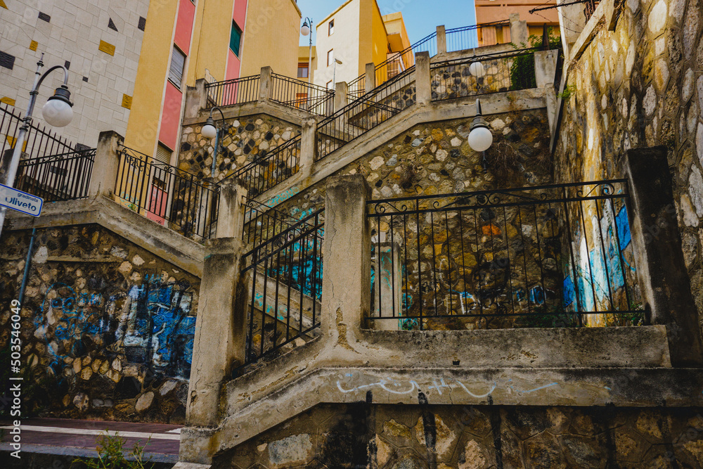 Low angle beautiful staircase buildings with graffiti in Messina in Sicilia, Italy