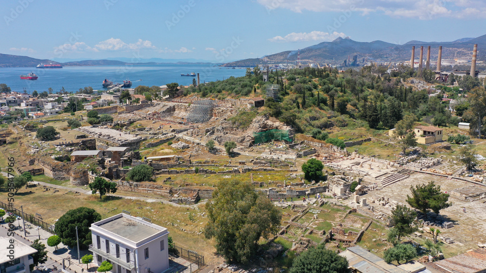 Aerial drone photo of iconic archaeological site and Sanctuary of Ancient Elefsina mainly known for the Great Mysteries - the Eleusinian Mysteries, Attica, Greece