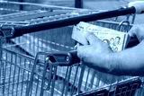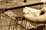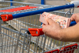 Shopping basket from a supermarket and Bolivia money held in Hands, Concept of inflation, More expensive purchases and the household budget