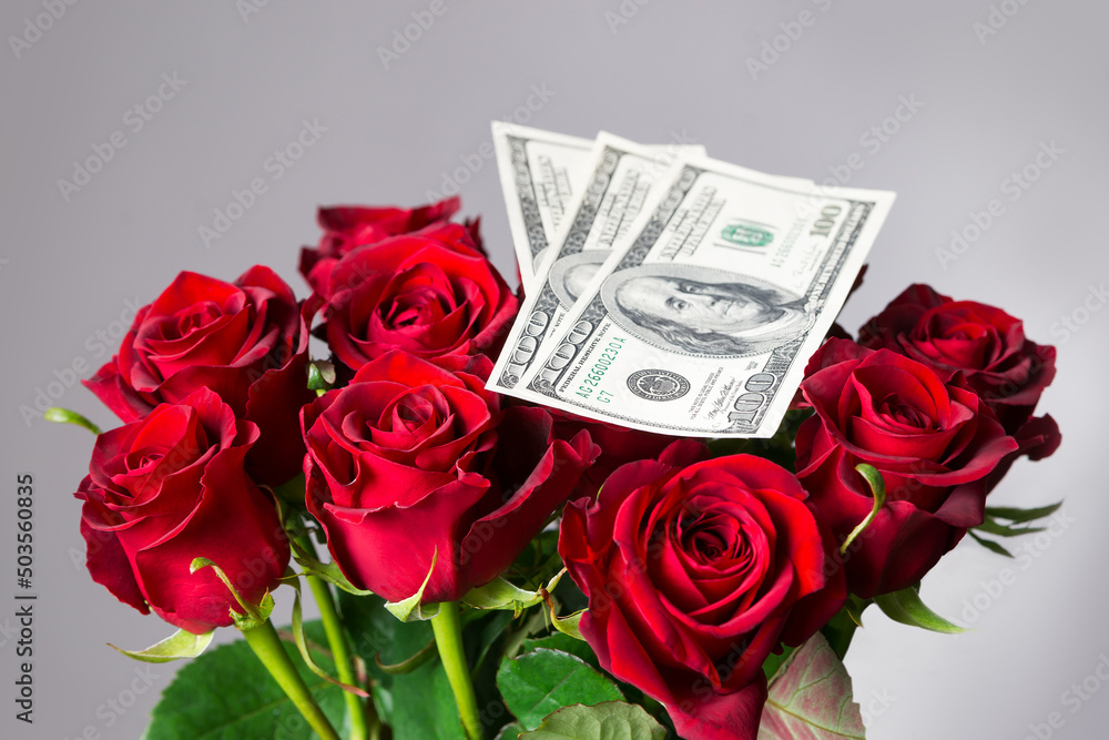 Bouquet of red roses and a hundred-dollar bills on a gray background