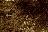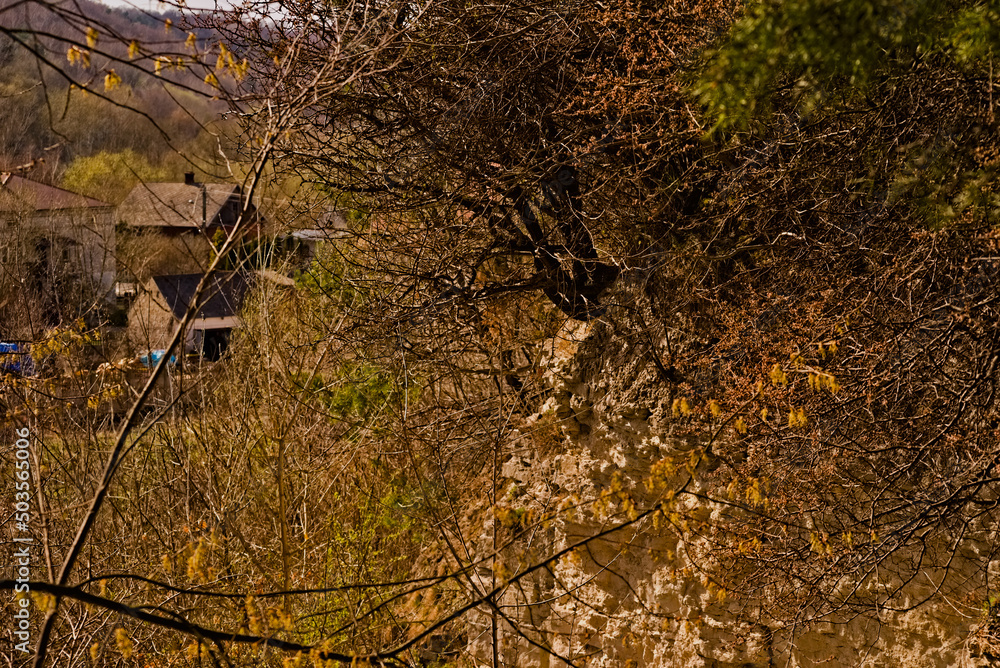Drzewo rosnące na skale piaskowcowej na skarpie , na zboczu wąwozu . W tle w dole widać wiejskie zabudowania . Wczesna wiosna o zachodzie słońca .