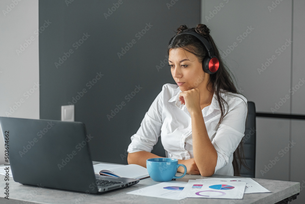 Young successful woman works using laptop and headphones. Paper work. Finance and planning.