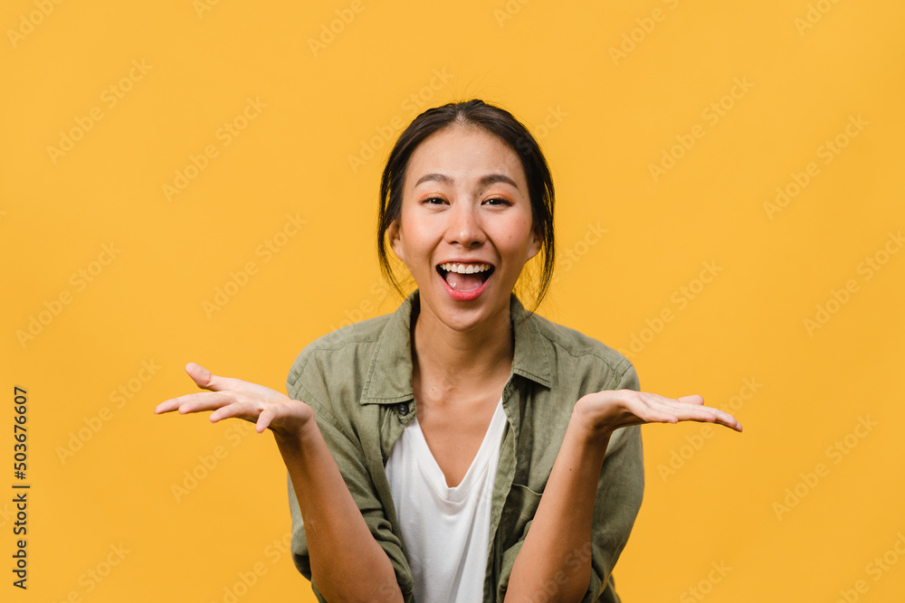 Young Asia lady feel happiness with positive expression, joyful surprise funky, dressed in casual cloth and looking at camera isolated on yellow background. Happy adorable glad woman rejoices success.
