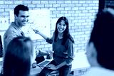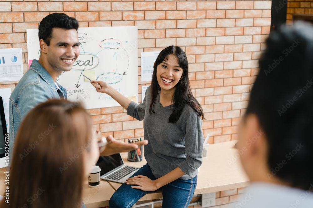 Asia businessmen and businesswomen meeting brainstorming ideas conducting business presentation project colleagues working together plan success strategy enjoy teamwork in small modern office.
