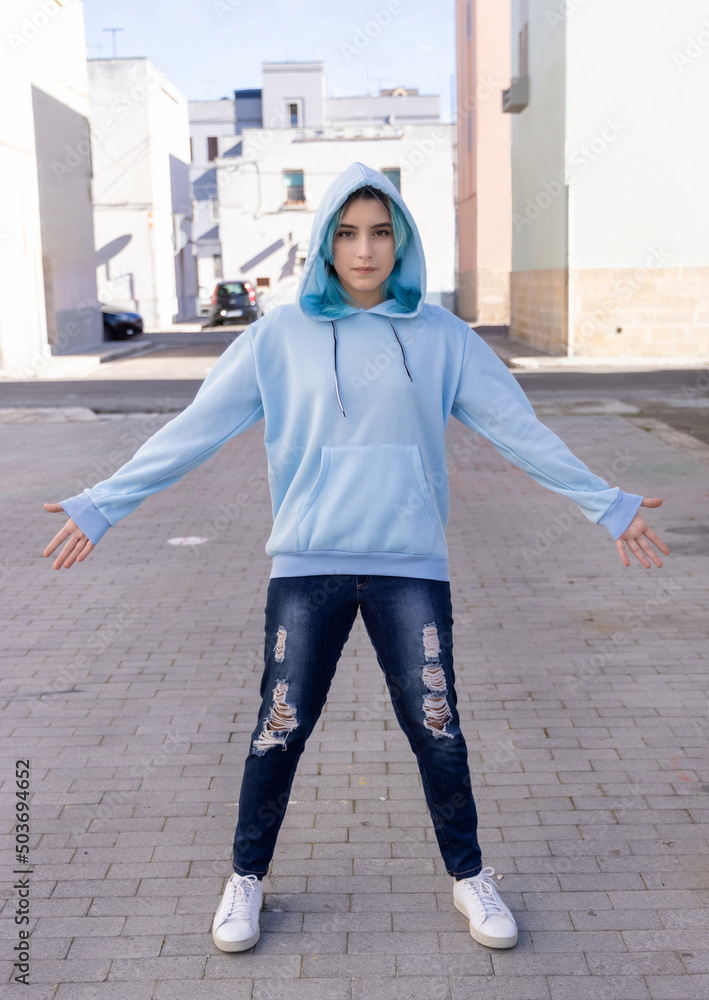 Teenage girl standing on a city street with opened arms. Hoodie mockup