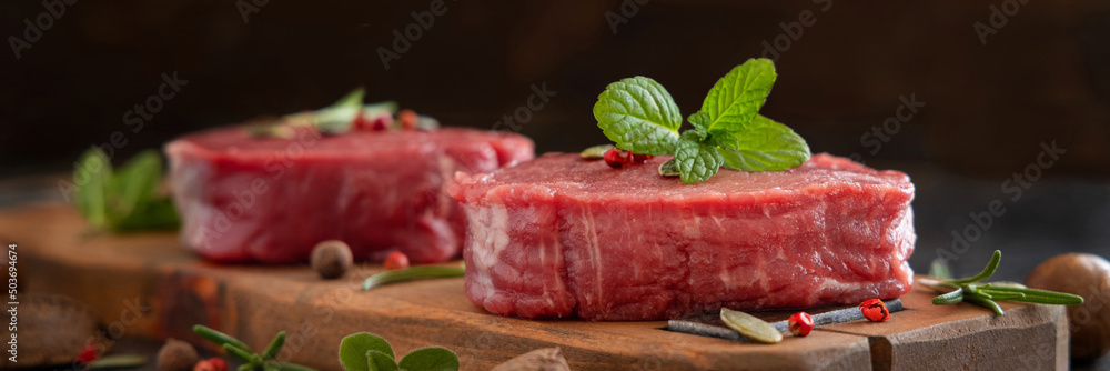 Raw beef fillet steaks with herbs and spices on dark table close up