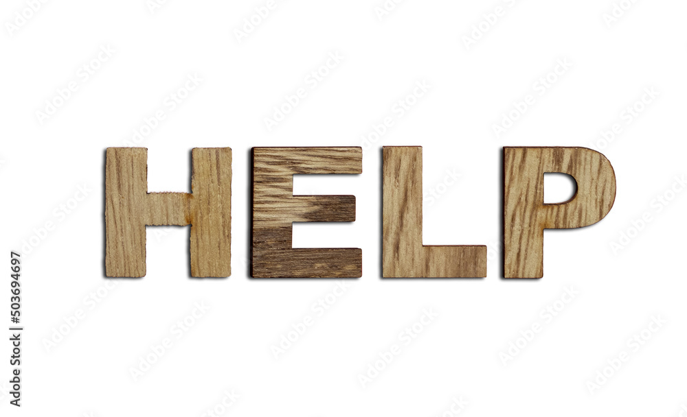 Help, word written in wooden alphabet letters isolated. Support and assistance to people