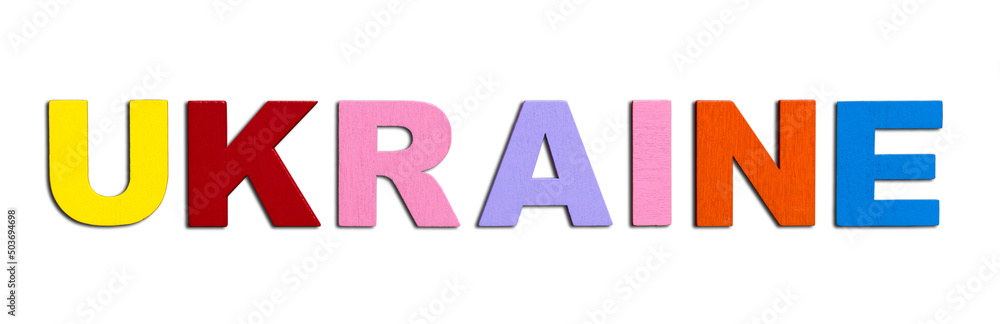 Ukraine, word written in colorful wooden alphabet letters isolated. The concept of a terrible war
