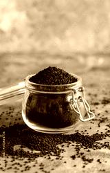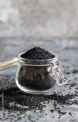 Indian spice Black cumin (nigella sativa or kalonji) seeds in glass jar close up