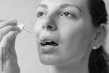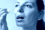 Portrait of dark haired young woman taking oil supplement with glass dropper. CBD hemp medicine oil applying on the tongue