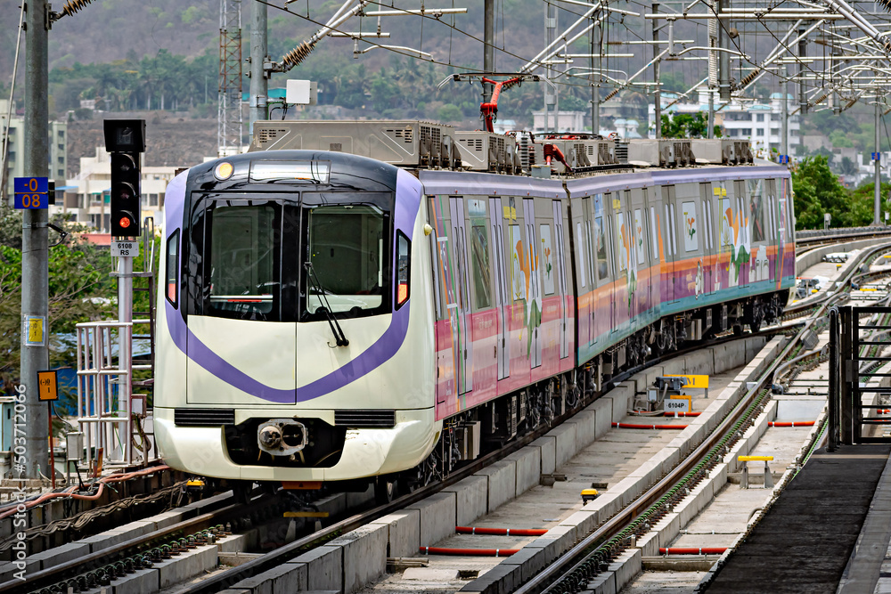 Close up image of Rapid transit metro train entering Vanaz station in Pune. This is a recently started service.