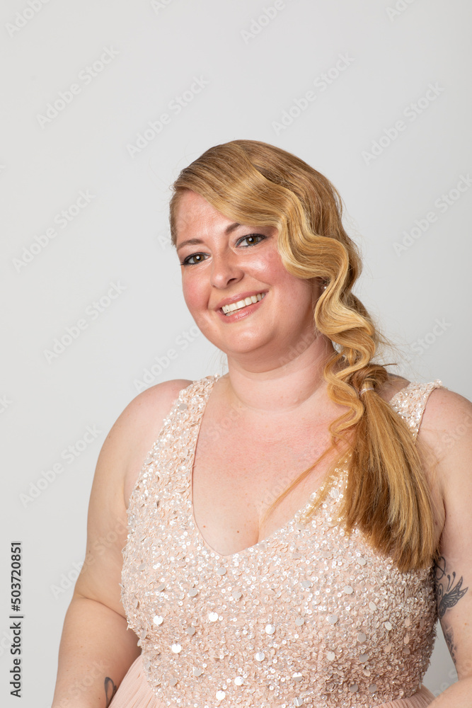 Portrait of a beautiful woman in her 40s. Long red blonde wavy hair with beautiful waves. The portrait is in studio on a white background.