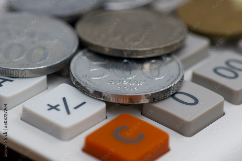 Close up of old Indonesian money rupiah coins on a calculator button, selected focus