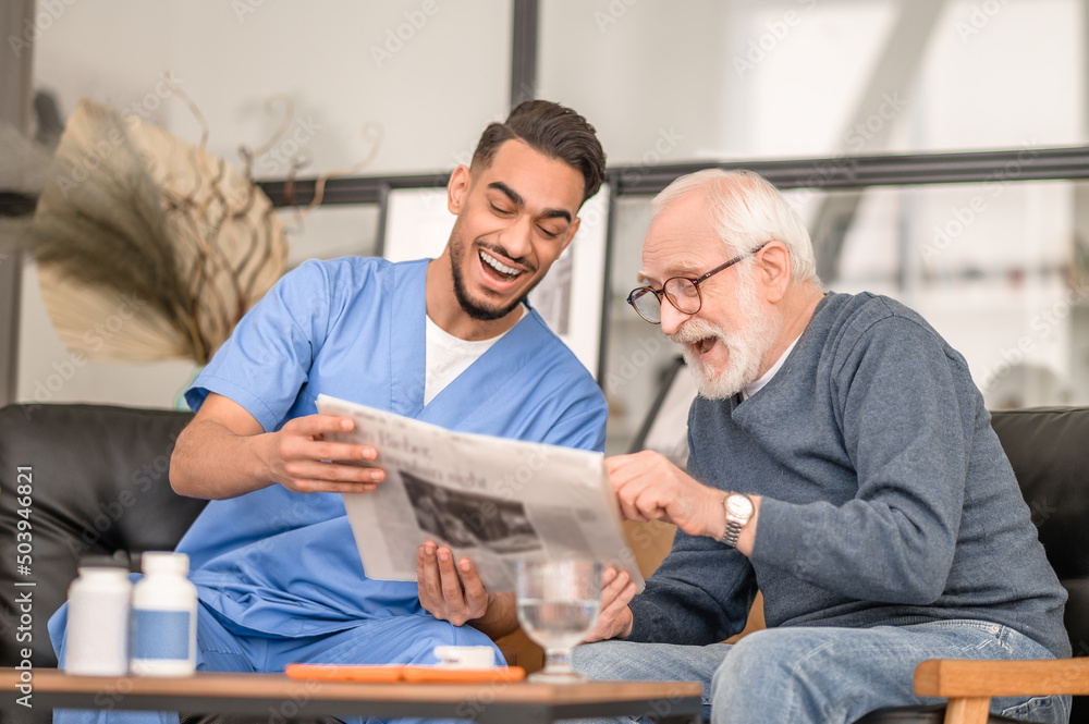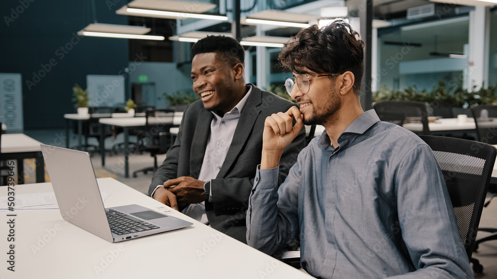 Side view diverse happy colleagues men african businessman talking with arabian employee worker having fun together pleasant conversation multiracial young people co-workers laughing joke at office
